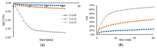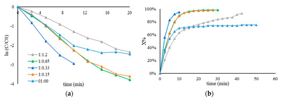 (a) Pseudo–first−order kinetic plot and (b) conversion plot using Au/AC synthesized using PVA-60 (derived from a PVAc Mn = 23,300) by varying the Au/PVA weight ratio. Reaction carried out by using 25 mL of 4–NP (2 × 10−4 M) and 25 mL of NaBH4 (9 × 10−3 M), 25 °C and different PVA amounts: 1.2 mL (Au/PVA (w/w)= 1:1.2), 0.65 mL (Au/PVA (w/w)= 1:0.65), 0.33 mL (Au/PVA (w/w)= 1:0.33), 0.15 mL (Au/PVA (w/w)= 1:0.15), and 0 mL (Au/PVA (w/w)= 1:0).