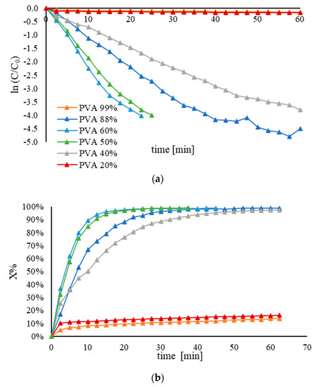 (a) Pseudo–first−order kinetic plot and (b) conversion plot for the comparison of the activity of Au/AC synthesized using PVA with different hydrolysis degrees. The reduction of 4–NP was carried out using 25 mL of 4–NP (2 × 10–4 M), 25 mL of NaBH4 (9.0 × 10−3 M), an Au/PVA weight ratio of 1:0.65, 4 mg of catalyst, at 25 °C.