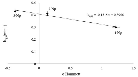 Hammett plot for the effect of the substituent in nitrophenol’s isomer on the catalytic activity, reaction carried out using 25 mL of NP (2 × 10−4 M), 25 mL of NaBH4 (9.0 × 10−3 M), Au/PVA weight ratio of 1:0.33, 4 mg of catalyst, at 25 °C.