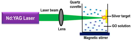 Natural graphite powder was incorporated for the synthesis of GO. A total of 1 g of sodium nitrate and 3 g of natural graphite were added to sulfuric acid (46 mL) and maintained in an ice bath with stirring. Then, 6 g of potassium permanganate was moderately added to this composition, and the solution was preserved below 20 °C with stirring. After that, the solution temperature was raised to 35 °C, and the solution was again stirred for one hour. Then, deionized water (40 mL) was slowly added to this solution, stirred for 30 min, and again diluted with deionized water (100 mL) in an ice bath to avert quick boiling because this procedure gives rise to a sudden increase in temperature. Finally, hydrogen peroxide (6 mL, 30%) was slowly added to the mixture. This resulted in the color change of the solution to bright yellow along with bubble formation. The final solution was filtered through filter paper (Standard Whatman filter paper having pore size 11 µm) and washed with deionized water until the filtrate was neutralized. The filtered material was then dried in a vacuum oven for 48 h. For attaining the proper vacuum conditions, the pressure was set to 10−3 mbar. The as-prepared GO nanosheets were used as the matrix for the in-situ decoration of Ag NPs via PLAL.