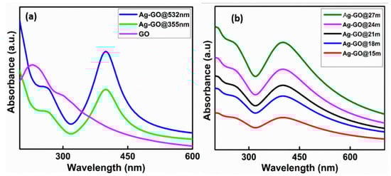 UV-Vis absorption spectra of (a) bare GO and laser-synthesized Ag-GO nanohybrid samples at 355 nm and 532 nm laser wavelengths and (b) Ag-GO nanohybrids synthesized at different ablation times (15, 18, 21, 24, and 27 min).