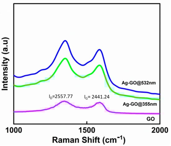 The Raman spectra show an intense peak at the D band (1350 cm−1) and a G band peak at 1589 cm−1, which declares the graphitic structure of a few-layered GO. The ID/IG ratio/value is used as a measure of the disorder/restoration of the graphene lattice, standing for the sp2/sp3 carbon ratio. The increased ID/IG value (1.14) of Ag-GO@532 nm is higher than that of both Ag-GO@355 nm (1.12) and bare GO (1.04), indicating that the Ag-GO@532 nm is having a higher concentration of Ag NPs; therefore, extra defects were introduced to the graphene sheets. These defects are allotted to the graphitic oxidation and Ag decoration effects in the hexagonal carbon lattice. Furthermore, it is noted that Ag-GO@532 nm and Ag-GO@355 nm exhibit higher Raman intensities than that of bare GO. This is because of the enhancement in the local electromagnetic field, which again substantiates the successful generation and anchoring of Ag NPs on the surface of GO layers. The intensified Raman signals of the Ag-GO samples compared with the bare GO is because of the effect of surface-enhanced Raman scattering due to the presence of Ag NPs []. Evidently, the generation of Ag NP during pulsed laser ablation and the interfacial binding between GO and Ag does not seriously affect the properties of the Ag NPs. Hence, compared to other chemical reduction methods, the pulsed laser ablation extends the advantage of contamination-free and a tunable decoration of Ag NPs on a few-layered GO, which is fundamentally important for various prominent surface activities.
