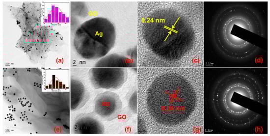 TEM and HRTEM images of (a–c) Ag-GO@355 nm, (e–g) Ag-GO@532 nm samples synthesized at 15 min ablation time and (d,h) selected area electron diffraction (SAED) patterns of Ag-GO@355 nm and Ag-GO@532 nm samples, respectively.