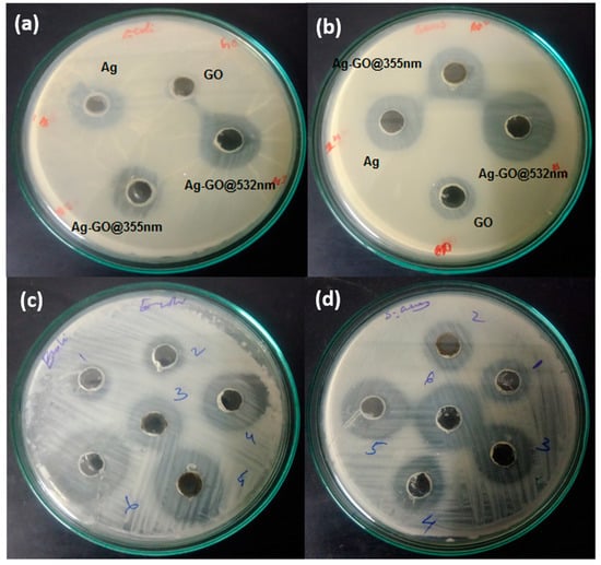 It is well understood from the images that both gram-negative and gram-positive strains were susceptible to the Ag-GO nanohybrid. The Ag-GO nanohybrid was synthesized at two different laser wavelengths and at five different time scales by keeping the laser energy constant at 400 mJ. The visible clear inhibition zones generated by the activity of Ag NPs, GO, Ag-GO@355 nm and Ag-GO@532 nm against the E. coli and S. aureus gives a clear evidence of the antibacterial efficiency. From Figure 5a,b, it is inferred that the zone diameter for the Ag-GO nanohybrid synthesized at 532 nm is larger than the others. Moreover, when the ablation time is increased from 15 to 27 min, the inhibition zone diameter became larger; from this, it can be concluded that the Ag NPs concentration was increased at higher ablation time. The same trend has been observed in the case of both gram-positive and gram-negative bacteria. Figure 5c,d illustrates the images of inhibition zone diameters of E. coli and S. aureus treated with Ag-GO@532 nm prepared at five different ablation times. Hence the activity is found to be higher for samples synthesized at larger wavelength and time frame.