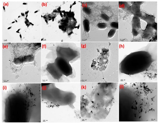 The TEM images of (a,b) E. coli bacteria treated with the sample Ag-GO@532 nm synthesized at the ablation time 15 min and (c–l) various destruction stages of E. coli bacteria.