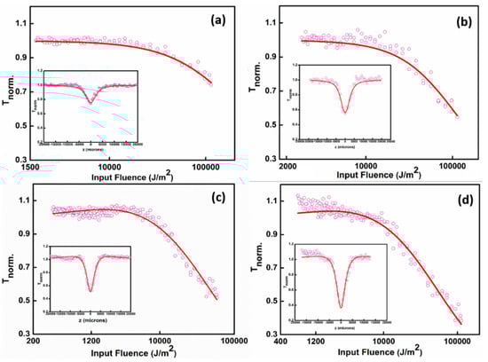 Optical limiting curves of (a) Ag NPs, (b) GO, (c) Ag-GO@355 nm, and (d) Ag-GO@532 nm synthesized at the ablation time of 15 min. Laser pulse excitation at a laser pulse energy of 40 µJ. Open circles: data points, solid lines: numerical fits to the corresponding data points.