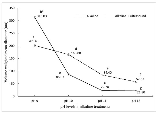 The effect of pH on pea nanoemulsion particle size synthesized using two different treatments. bcdefg Means (± standard deviation) with the same letter are not significantly different (p ≤ 0.05).