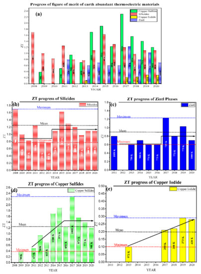 (a) Recent progress of figure of merit (ZTmax) of Earth-abundant low-toxic thermoelectric materials; Low-temperature thermoelectric materials (copper iodide and its alloys), Intermediate and high-temperature thermoelectric materials (copper sulfides, silicides, Zintl compounds, and their alloys) from the year 2008–2020. The temperatures at which the maximum ZT recorded is mentioned in the bar-charts. (b) silicides, (c) Zintl compounds, (d) copper sulfides, (e) copper iodide (Tables 1 and 2).