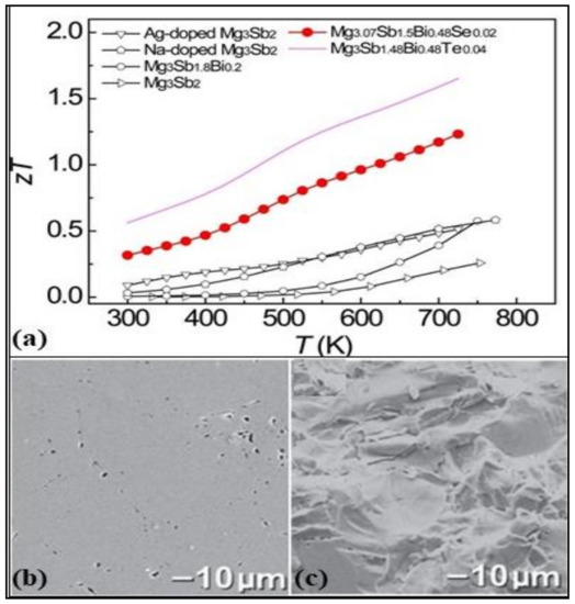 CaMgSi and Mg2Si are prominent thermoelectric materials due to their non-toxicity, low material density, natural abundance, and easily modifiable electronic structure. Mg2Si has low thermal conductivity and high Seebeck coefficient but lags in its electrical conductivity in the medium to the high-temperature range of 300–700 K. The reason for low electrical conductivity is due to the decreased mobility of charge carriers. This can be negated by appropriate doping and alloying. To find the appropriate alloy compound, VKK Zaitsev conducted series of detailed tests on Mg2BIV(BIV = Si, Sn, Ge) compounds in the temperature range 300–870 K, and a highly reliable and reproducible ZT value of 1.1 was reported in the case of the n-type solid solution of Mg2Si1−xSnx [86]. Mg2Sn and Mg2Si are two indirect bandgap materials that have their respective low-lying conduction band edges reserved. Effect of band convergence on the thermoelectric properties in a series of Mg2Si1−xSnx solutions doped with a negligible amount of antimony showed exceptionally high ZT values of 1.3 near 700 K at x~0.7 [87]. This study suggested that achieving valley degeneracy by varying the compositions is an efficient strategy for better thermoelectric properties. The materials synthesized by high energy mechanical alloying and then sintering of mechanically alloyed powder at 973 K for 20 min resulted in a record-high ZT value of 1.4 for n-type Mg2Si0.4Sn0.6 [88]. The recent progress of both p-type and n-type magnesium silicide alloys is given in Figure 7e.