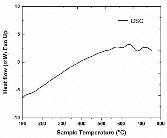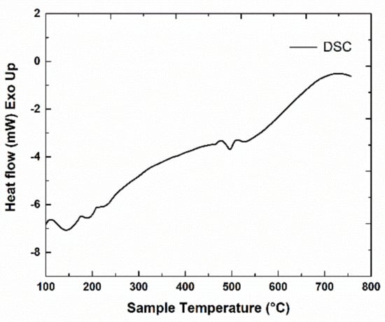Regarding the phase transformation evolution with temperature in metallic alloys, one of the most promising techniques is the differential scanning calorimetry (DSC). In our alloys, DSC analysis was undertaken in order to notice and monitor thermal events or heat exchange with the environment, illustrated as exo- or endo-thermic peaks. Events that occur with temperature increase are related to intrinsic structural effects that employ change of the internal energy and are associated to structural phase transitions. The DSC scans have been performed on both the Mn-Al-C alloys. Measurements were taken from 100 °C up to 750 °C with a heating rate of 5 °C/min. The heat exchanged with the exterior environment, measured by comparison with a reference crucible heated to the same temperature, was recorded during the heating process and the data obtained for the 2 samples are presented in Figure 1 and Figure 2. Besides the constant heat flow increase with increasing temperature, few heat flow effects (exo- and endo-thermal) are noticed in both graphs. The effect attributed to the structural phase transformation leading to the formation of τ-MnAl phase was found at 504 °C for the sample Mn53Al45C2 (Figure 1). A similar peak was noticed also by Lu et al. [32] in Mn55Al45 at 492 °C and assigned to the occurrence of the τ-phase. An exothermic effect at 509 °C was recorded in another work [29] for Mn0.55Al0.45C0.02 and again assigned to the occurring of τ-phase. For the sample Mn52Al46C2, the exothermic effect recorded in the previous graph is postponed with about 100 °C to about 606 °C (Figure 2), this peak also being assigned to the ε-τ transformation. The delay in formation of the τ-MnAl phase is in this case most probably related to the higher activation energy induced by the increased Al content. It can be seen in the Mn-Al phase diagram [13] that the limit of formation of the τ-phase is exceeded when lowering the Mn content below 53 at.%; therefore, during the non-equilibrium heating process of the DSC study, a higher activation energy is required for triggering the formation of the τ-phase.