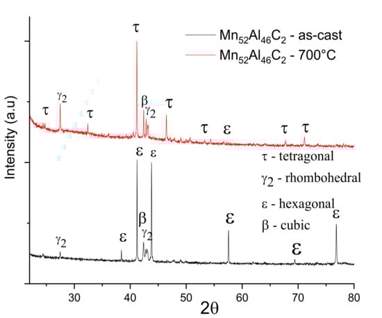 An almost similar situation is encountered also for the Mn52Al46C2 alloy, as-cast and also annealed at 700 °C (Figure 4). Here, the as-cast state is also characterized by a predominance of the hcp ε-phase which transforms after annealing in a more complex phase structure. In this case, the ε-τ structural phase transformation is also almost full, with a formed τ-phase of about 91%, almost complete disappearance of cubic β-phase, and the remaining 9% abundance being made of rhombohedral γ2 phase and primitive cubic β-phase, with lattice parameters almost equal to the previous case, within the range of estimation errors. The crystallite average size, calculated from the full profile analysis fitting results, shows almost similar values: 232 ± 14 nm for the two most intense lines of the τ phase in the annealed sample, and respectively 198 ± 15 nm for the ε phase in the as-cast sample.