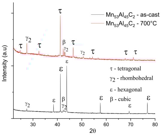 X-ray diffractograms for samples Mn53Al45C2 as-cast and annealed at 700 °C.