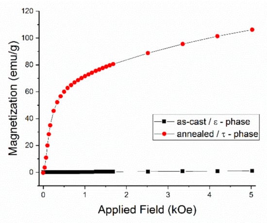 - Jiménez-Villacorta, F.; Marion, J.L.; Oldham, J.T.; Daniil, M.; Willard, M.A.; Lewis, L.H. Magnetism-Structure Correlations during the ε→τ Transformation in Rapidly-Solidified MnAl Nanostructured Alloys. Metals 2014, 4, 8–19. [Google Scholar] [CrossRef]