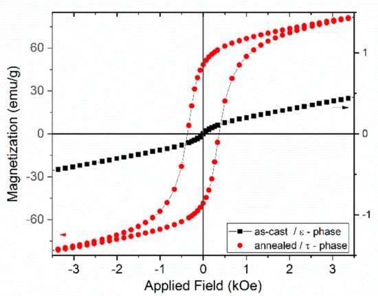 The initial magnetization as well as the hysteresis loops of the as-cast and annealed Mn53Al45C2 have been measured using SQUID magnetometry in a measurement setup having the magnetic field applied parallel to the ribbons plane. The field is applied up to 80 kOe and data are recorded at 27 °C. The initial magnetization curves for the as-cast and annealed Mn53Al45C2 samples are shown in Figure 5 and the hysteresis loops of the same samples are depicted in Figure 6. The as-cast sample, where it has been shown that the hcp ε-phase is predominant, exhibits a very low, linear, increase of magnetization, a behavior which is typical for antiferromagnetic materials. The annealed sample, where it has been shown that the tetragonal τ phase has become predominant, have completely different features, with a sharp increase of magnetization towards high values (up to about 106 emu/g) and a steady approach to saturation. The ferromagnetic character assigned to the tetragonal τ phase lacks soft magnetic features, taking into account that the saturation is not reached even at the highest applied magnetic field (80 kOe). This behavior is preserved also for the recorded hysteresis loops (Figure 6). The as-cast sample has quite linear dependence on the applied magnetic field with very small induced magnetization, of the order of 1 emu/g (right Y axis on the graph). The annealed sample shows, in agreement with the initial magnetization behavior, very large values of magnetization, in addition to a quite important increase of the coercive field, up to about 0.4 kOe. The large value of the observed coercivity, viewed together with the lack of saturation of the measured values of magnetization are considered as being the consequence of an arrangement of frustrated moments of the Mn ions in the tetragonal τ phase.