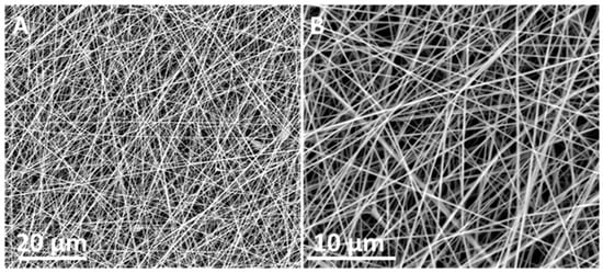 The morphology of the electrospun fibers was determined by a field emission scanning electron microscope (FE-SEM) using a Hitachi TM-4000 (Tokyo, Japan) with an electron beam acceleration of 10 kV. Analysis of the fiber diameter was carried out with the ImageJ software (version 1.52, National Institutes of Health, Bethesda, MD, USA). At least 100 fibers were randomly selected and measured from three different images. The average fiber diameter as well as the standard deviation (SD) were calculated and are presented in the corresponding Figures.