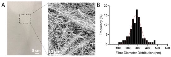 (A) Macroscopic and microscopic images of the spunbound polypropylene (SPP) coated with the with polyacrylonitrile (PAN) electrospun fibers. (B) Average fiber distribution of polyacrylonitrile (PAN) electrospun fibers.