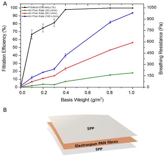 It is known that when the basis weight is increased in filters, dramatic changes in filter efficiency may occur, especially for nanofibrous filters, where a low basis weight is required for high filtration performance and low pressure drop [16,20,37,38]. In fact, the use of nanofibers in air filtration applications requires much less basis weight than the microfibrous-based filters [11,16,39] and hence, the optimum basis weight of PAN fibers to obtain a high filter efficiency and low breathing resistance was investigated (Figure 3A). To do this, a mass deposition of nanofibers ranging from 0.1–1 g/m2 were deposited on an SPP by electrospinning. Thereafter, another SPP was placed over the electrospun deposition to protect the PAN fibers and to provide better structural rigidity to the filter (Figure 3B) [17]. Figure 3A shows the relationship between the basis weight against the filter efficiency and breathing resistance. Initially, two layers of SPP/SPP without nanofibers were measured as the reference system. The filter efficiency was very poor, with a value of approximately 2.62 ± 1.78%. In terms of the breathing resistance, the value was below 20 Pa for all the flow rates tested. Once the PAN electrospun fibers were added to the substrate, an increase in filtration efficiency of up to 60–70% was observed by using only 0.1 g/m2. As the basis weight increased, so did the filter efficiency, reaching a 97% at 0.4 g/m2 and maintaining between 97–99% for the 0.8 and 1 g/m2 basis weight. As expected, the higher the filtration efficiency, the higher the breathing resistance achieved for the three different air flows (30, 95 and 160 L/min), with values reaching their maximum at 1 g/m2 basis weight. It should be borne in mind that testing was done in filter areas of 50 cm2; thus, although filtration efficiency should not, and has not been seen (i.e., 50 vs. 100 cm2, results not shown), to depend on filter area, breathing resistance is expected to decrease linearly with the increasing sample area. Respirators for personal protection typically have areas larger than 200 cm2, so to anticipate the actual breathing resistance on a typical final respirator, these values should be divided by, at least, a factor of 4.