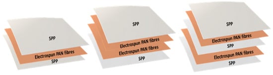Schematic of the mono and multilayer structures of spunbond polypropylene/polyacrylonitrile/spunbond polypropylene (SPP/PAN/SPP), spunbond polypropylene/polyacrylonitrile/polyacrylonitrile/spunbond polypropylene (SPP/PAN/PAN/SPP) and spunbond polypropylene/polyacrylonitrile/spunbond polypropylene/polyacrylonitrile/spunbond polypropylene (SPP/PAN/SPP/PAN/SPP) filters, prepared with PAN electrospun nanofibers.