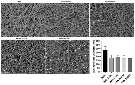 Field emission scanning electron microscope (FE-SEM) micrographs and average fiber diameter of the electrospun polyacrylonitrile (PAN) and PAN containing Zinc Oxide nanoparticles (PAN-ZnO) at 1 (PAN-ZnO1), 3 (PAN-ZnO3), 10 (PAN-ZnO10) and 20 (PAN-ZnO20) wt.%. Scale bar = 10 µm. Results are presented as mean ± SD (n = 3).