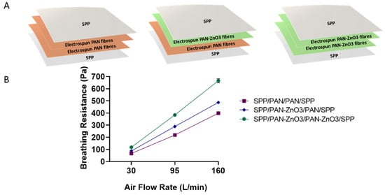 (A) Schematics of the multilayer filter configurations, spunbond polypropylene/polyacrylonitrile/polyacrylonitrile/spunbond polypropylene (SPP/PAN/PAN/SPP), spunbond polypropylene/polyacrylonitrile/polyacrylonitrile-zinc oxide/spunbond polypropylene (SPP/PAN-ZnO3/PAN/SPP) and spunbond polypropylene/polyacrylonitrile zinc oxide/polyacrylonitrile zinc oxide/spunbond polypropylene (SPP/PAN-ZnO3/PAN-ZnO3/SPP). (B) Breathing resistance of the above-mentioned configurations, SPP/PAN/PAN/SPP, SPP/PAN-ZnO3/PAN/SPP and SPP/PAN-ZnO3/PAN-ZnO3/SPP with a total of 0.4 basis weight (g/m2).