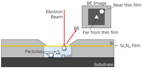 In most cases, SEM observation is performed in vacuo because electrons are scattered by molecules in air or in water. Therefore, the observation of nanomaterials in water remains difficult. Recently, we attempted to use an in situ holder (FlowVIEW Tek) with a 30 nm thick Si3N4 window. Figure 3 shows a schematic of the in situ holder. This holder enables SEM observation of nanomaterials in water by detecting electrons penetrated through the window [21]. This window has sufficient strength to hold water during the SEM observation. Si3N4 is composed of lighter elements; thus, electrons are less scattered by this window.