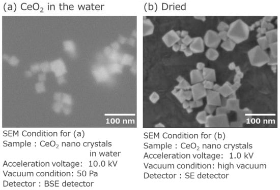 Figure 8a shows an image of the CeO2 nanocrystals in water. Usually, nanomaterials which are smaller than 50 nm in water cannot be observed using SEM. However, as shown in Figure 3, the use of an in situ holder enabled observation. As confirmed in Figure 8a, the size and dispersive of the CeO2 nanocrystals in water were visualized. By comparing the SEM images obtained in vacuum (Figure 8b), we noticed that the measurement of nanomaterials in water well reproduced the size and dispersive of the CeO2 nanocrystals.