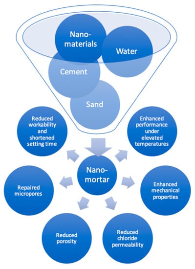 The cement, sand, nanomaterial(s), and water form important constituents of mortars incorporating nanomaterials (Figure 1).