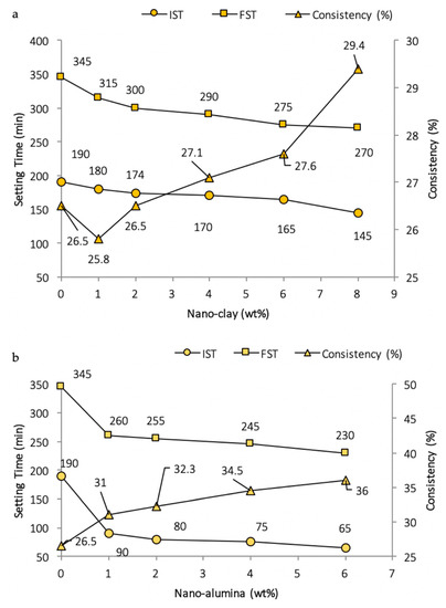 A Vicat apparatus as per ASTM C-187 and C-191, respectively, was utilized to measure standard consistency and setting times [35,79]. It is clear from Figure 2 that once proper dispersion of nano-silica is achieved, the setting time accelerates [20,28]. Similarly, the inclusion of nano-TiO2, nano-clay, and nano-alumina leads to absorbance of some of the water due to their high surface areas and fineness, which increase the water demands and shorten the initial setting time (IST) and final setting time (FST) [41,57]. For composite cement pastes, which after the addition of ground blast furnace slag (GBFS) and superplasticizer comprise OPC–GBFS–nano-clay, the consistency decreases and setting times increase [101]. The same is true for the addition of a superplasticizer with a nano-clay, which leads to a decrease in water absorption and increases the initial setting times [18].