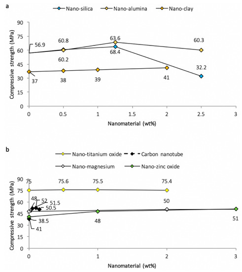 Variations of 28-day compressive strength in cement mortar due to: (a) nano-silica and nano-alumina [30] and nano-clay [79]; (b) nano-titanium oxide [82], carbon nanotubes [54,110], nano-magnesium oxide [52], and nano-zinc oxide [54].