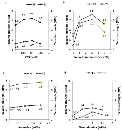 Variations of 28-day flexural and tensile strengths in cement mortar due to: (a) CNT [110]; (b) nano-titanium oxide [137]; (c) nano-clay [79]; (d) nano-alumina [113].