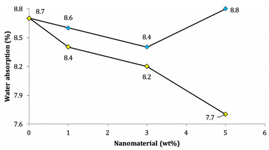 Variations of water absorption in cement mortar due to: (blue diamond) nano-silica; (yellow diamond) nano-titanium oxide [118].