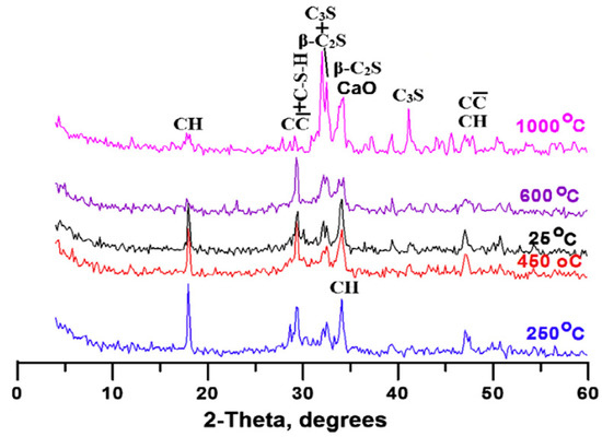 XRD patterns of I.3 cement pastes containing 4 mass% of NS as a function of treatment temperature up to 1000 °C (taken with permission from [103]).