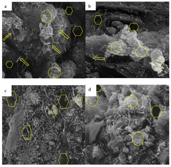 In the absence of nanomaterials, the mortar matrix has a dispersed structure and the voids (as shown by yellow ovals) and needle-like ettringites (as shown by yellow arrows) are more prominent than in the treated sample (Figure 12). However, the presence of nanomaterials causes the mortar to have a dense structure by reducing the number of voids and ettringites, as they can promote the formation of C–S–H gel through an accelerated hydration process [30,80,147]. However, the addition of nanomaterials accelerates the hydration process and enhances the formation of C–S–H gel (as marked by yellow hexagons), which makes the microstructure denser, thereby increasing the strength and durability of the treated sample. However, non-uniform dispersion or excessive addition of nanomaterials (beyond an optimum dosage) leads to agglomeration and formation of weak bonds in the mortar sample [77,148,149,150]. Ling et al. [13] observed that the inclusion of nano-silica in the mortar reduces the pores, concentrates the matrix, and enhances the strength of cementitious composites by improving the adhesion of the hydration products with the PVA fibers. Adding nano-titanium oxide to the mortar improves the microstructural and mechanical properties, such as compressive and flexural characteristics of composites, by consuming portlandite crystals and increasing the amount of C–S–H gel [106]. Tamimi et al. [65] showed that due to the interactions of the carboxylic groups present on the surfaces of CNTs and C–S–H, the flexural strength is increased. The interactions lead to strong covalent bonds at the interfaces between the CNT reinforcement and the matrix of cementitious compounds that bridge the microcracks.
