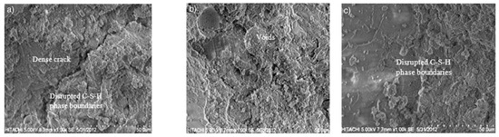 Furthermore, [48] indicated that at 400 °C the dense cracks in control samples were transformed into voids and hairline cracks around the boundaries with the increase in the nano-alumina content. The decomposition of CH and C–S–H due to the release of water from hydration products may have been the reason for hairline cracks around the perimeter in specimens treated with nano-alumina. This phenomenon is apparent in SEM images (Figure 13).