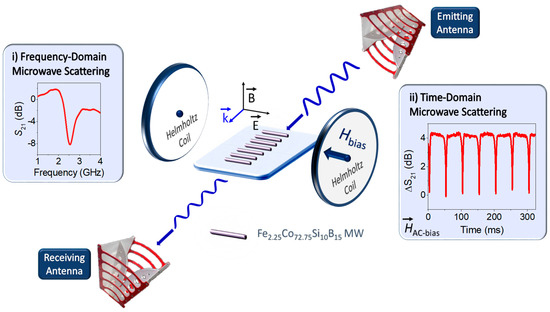 Schematic representation of the microwave scattering mechanism in transmission mode for sensing array platforms composed by Fe2.25Co72.75Si10B15 (lengths of a few cm). Two Helmholtz coils apply axial magnetic fields to induce large changes in the magnetic state of the Co-based microwires (MWs) and then, giant magneto-impedance (GMI) effects arises. The S21 transmission coefficient is obtained in the (i) frequency and (ii) time domains.