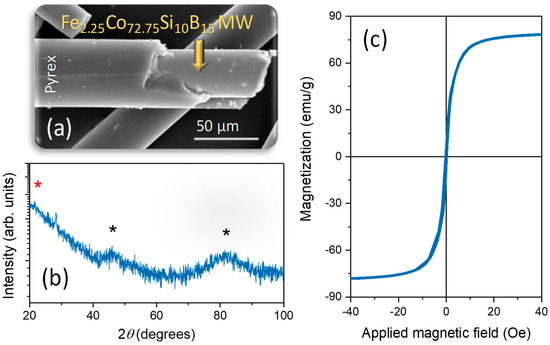 (a) The scanning electron microscopy (SEM) image, (b) X-ray diffraction (XRD) pattern, and (c) magnetic hysteresis loop of Co-based MWs. The amorphous contributions of the Pyrex and the Co-based alloy are indicated by red and black asterisks, respectively, in Figure 2b. The hysteresis loop is performed in one single Co-based MW at 25 °C.