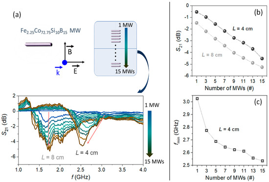 In previous works, the position of the dipole resonance varies with the length L of the MW, while considering Equation (2) [48,51]. In accordance with those, lengths of 4 cm and 8 cm are chosen to evaluate the microwave scattering behavior of the MWs, when they are arranged in a linear array. Figure 3a shows how the fmin that is associated to the maximum scattering for a single MW falls around 3.03 GHz and 1.64 GHz for the lengths of 4 cm and 8 cm, respectively. Accordingly, their maximum scatterings are located in the S-band (short wave region) and in the L-band (long wave region). As the number of parallel MWs increases, noticeable changes are detected in the intensity, bandwidth, and position of the minimum S21. Specifically, the |S21| coefficient at fmin of both array configurations shows an almost linear trend with an increase of −3.8 dB and −4.0 dB for 4 cm and 8 cm length, respectively, from 1 MW to 15 MWs (Figure 3b).