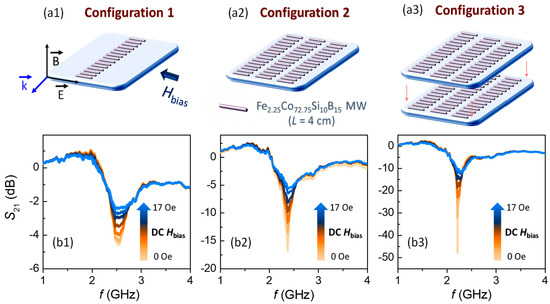 Effect of an external DC magnetic field with increasing value up to 17 Oe in the microwave scattering spectrum: (a1–a3) schematic illustration of MWs configurations and (b1–b3) S21 transmission coefficient obtained for the configurations 1, 2, and 3.