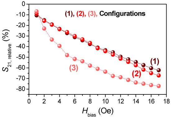 As the magnetic DC field is increased from O to 17 Oe, the S21 coefficient is strongly flattened for all of the analyzed configurations. The most remarkable change is found in configuration 3, with a progressive increase from ~−47.9 to ~−11.6 dB (Figure 4b3). The applied DC magnetic field increases the permeability of the MWs, which, in turn, is closely related to their impedance. In Figure 4b1–b3, these effects are noted gradually up to a maximum applied magnetic field of 17 Oe (a value near the anisotropic field according to Figure 2c). Moreover, DC magnetic fields also affect the bandwidth, which increases by one order of magnitude when the field is present (for example, configuration 3 goes from ~0.03 GHz at Hbias = 0 Oe to ~0.34 GHz at Hbias = 17 Oe). The field-based broadening is also observed in composites that contain short Co-based MWs [29]. In contrast, the fmin is barely modified by this effect due to its electric dipole character (Equation (2)). To compare the evolution of the field-dependence of the S21 coefficient obtained from the three configurations, its relative variation (S21,relative) is represented as a function of the DC applied magnetic field shown in Figure 5.