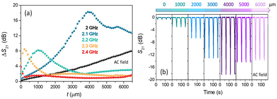 The addition of different polymeric slab thicknesses causes a variation in the effective permittivity (εeff) [2,3,37,54], producing modifications in the fmin (Figure 6c). As the thickness of the layer increases, the fmin of the system decreases from ~2.37 GHz to ~2.07 GHz, being associated with an increase in the εeff of the medium. This is why ∆S21 vs. thickness (Figure 6c) has been determined tuning the fixed microwave frequency in the domain time measurement at the fmin of each thickness. When no polymer slab is used, the amplitude value of ∆S21 is close to ~−5.9 dB. In contrast, the ∆S21 increases considerably up to ~−24.2 dB, with an almost linear trend up to thickness (t) ~3100 µm. Beyond that, it reaches a stabilization level of ~−25.1 dB that could be considered as a broad system’s matching thickness [55,56]. The example presented shows the high versatility of the designed systems to obtain adjustable time-resolved variations up to ~−25.1 dB for the configuration 2. Surprisingly, the system has a high sensitivity to the progressive addition of polymer slabs with a thickness below 3100 µm (Figure 6c), indirectly obtaining the added thicknesses by knowing the AC applied magnetic field with a resolution of ~5.10−3 dB/µm. For sensor applications, it is important to widen the spectral effectiveness of the electromagnetic frequency near the antenna resonance exhibited. In this line, the time-resolved modulation is also investigated for frequencies that are located in the vicinity of the fmin (2.40 GHz). Figure 7a displays the effect of the polymeric slab thickness (t) on the ∆S21 modulation for five selected frequencies, varying from 2.00 GHz to 2.40 GHz (within the dipole scattering).