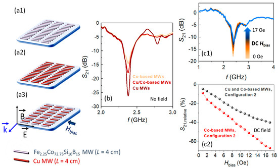 Configuration 2 is chosen as an example of potential technological application to exploit the proposed approach to improve the amplitude of microwave scattering maintaining the ability to be modulated with DC magnetic fields. For this end, array sensing platforms are fabricated to evaluate their microwave scattering properties while using Co-based MWs (Figure 8a1), Cu MWs (Figure 8a2), and a combination of alternating Co-based and Cu MWs (Figure 8a3). Under non-applied field conditions (Figure 8b), the resonant frequency fmin is located around ~2.38 GHz for the three sensing array platforms (L = 4 cm) confirming the antenna character of the Co-based MWs. In contrast, the resonance amplitude increases dramatically from ~−14.4 dB (Co-based MWs configuration) to ~−26.2 dB (Cu MWs configuration). For the array combination of alternating Cu and Co-based MWs, a minimum amplitude of the S21 transmission coefficient is recorded with an intermediate value between the previous configurations of ~−17.8 dB. However, the latter combination retains the advantage of being able to adjust the minimum amplitude through the application of relatively low strength magnetic fields due to the ultrasoft magnetic character of the Co-based MWs (Figure 8c1). In this line, Figure 8c2 shows the variation of the peak amplitude, when a DC magnetic field up to 17 Oe is progressively applied. For such a field, a minimum value of ~−11.2 dB is recorded. By calculating the values of S21,relative (Equation (6)), a linear decreasing trend is also detected, as happened with the Co-based ones (combination (a1) in Figure 8), but with a lower slope reaching a maximum variation of ~40%. Such a reduction is expected, since only the Co-based MWs are affected by the DC magnetic field. However, these are interestingly high values of microwave attenuation keeping an amplitude of the recorded scattering significantly higher than the Co-based arrays. Furthermore, regardless of the DC-modulation character, this result might also be attractive for electromagnetic shielding applications, because this combination displays a microwave scattering of ~−11.2 dB at ~2.38 GHz, even with an external DC applied magnetic field with intensity of 17 Oe.