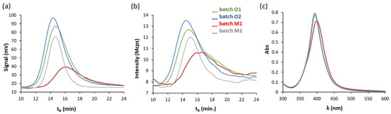 Four different batches of commercial NPs were tested here: M1, M2, O1 and O2 (see the previous section for explanation). The spectra obtained for diluted dispersion with ultrapure water before 2 h of preparation were the same for each batch assayed. Figure 2 includes the fractograms and UV-Vis spectra corresponding to fresh dispersions diluted 1/4 with ultrapure water. Fractograms recorded using UV-Vis detector (Figure 2a) show a clear difference in batch M1 in reference to the others, in which a displacement of the maximum peak is observed up to 16 min, which is consistent with the presence of larger NPs, as well as a decrease in the signal at λ = 395 nm, which can respond to an SPB sift to higher wavelengths than those corresponding to the other dispersions as Table 2 shows, but also due to lower mass of AgNPs. The peak areas were 27.9, 25.9, 23.3 and 22.9 V.s for batches O2, O1, M2 and M1, respectively.