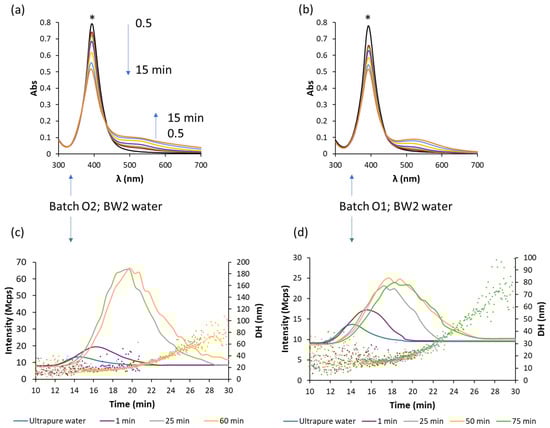 Spectra of batches O2 (a) and O1 (b) diluted 1/4 with bottled mineral water measured at several times (0.5, 1, 2, 5, 10, 15 min, the SPR band for the dilution with ultrapure water was also included, marked with *) and their fractograms (solid lines) (c) and (d), respectively, by using dynamic light scattering (DLS) and hydrodynamic diameter (points) measured at different times.