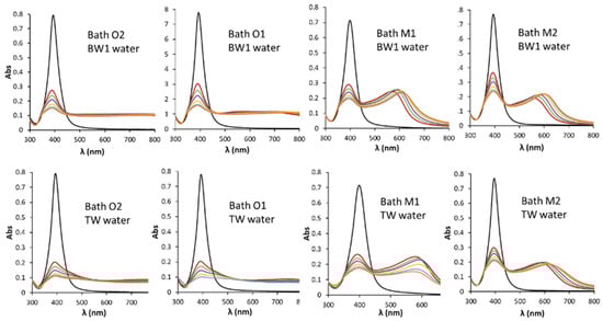 Decreasing of the plasmonic band can be attributed to a concentration decrease of the initial AgNPs as a consequence of changes in their electrostatic environment, which lead to processes like aggregation, which cause structural, morphological and surface alterations. In this sense, as can be seen in Figure 4, a higher degradation rate is observed when BW1 and TW waters were employed for diluting batches O instead of BW2 water (see Figure 3). The profiles obtained were similar for the batches with the same caducity data. Those waters presented higher conductivity than BW2 as can be seen in Table 3, and then, higher ionic strength. The aggregation is more severe for O1 and O2 batches than that obtained for M1 and M2 batches in BW1 and TW waters, although their ʒ-potentials were somewhat greater in absolute values for O than for M batches. The electrostatic interactions between a charged NP and an electrolytic solvent fall within one of three regimes as proposed in [37] for citrate capped AuNPs, according to the net charge of the sphere: (i) depolarized (σ = surface charge density < ~0.6 e nm−2), where the thermal motion of the sodium counterions overcomes the electrostatic attraction toward the NP; (ii) mildly polarized (~0.6 < σ < ~4.1 e nm−2), in which the Coulomb forces attract enough ions into the Stern layer to screen out the charge load of the NP, and (iii) hyperpolarized (σ > ~4.1 e nm−2), the situation at which the counterions’ steric and electrostatic hindrance, as well as their loss of translational degrees of freedom, limit their binding onto the NP. The chemisorption of citrate onto the assembled metallic surfaces critically depends on variables such as the particle size, the surface charge density, and the ionic strength of the medium in which the NPs are dispersed [37].