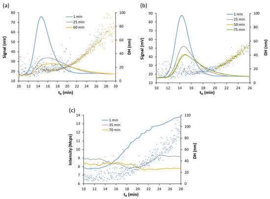 Fractograms (solid line) and hydrodynamic diameter (points) obtained for suspension of batches O2 (a) and O1 (b) diluted 1/4 with BW2 water at different times using UV-Vis detector. (c) Fractograms and hydrodynamic diameter for suspension of batch O2 diluted 1/4 with BW1 water at different times using the DLS signal.