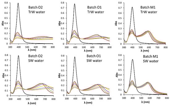 Since the mechanism through which electrolytes facilitate aggregation consists in the shielding of the charge that covers the NPs, some factors such as ion charge are directly related to their shielding capacity, and consequently, induce the aggregation process. In this sense, there is an inverse dependence of the CCC with the sixth power of the ion charge [43] giving rise to a greater influence of divalent ions compared to monovalent ions between 50–83 times [42] in the aggregation process. Their stability depends to a great extent on the stabilizing agent that is part of their coating. In this sense, the characteristics and behaviors observed are attributable to the electrostatic stabilization mechanism, since AgNPs stabilized by steric effect by coatings such as PVP, PEG or branched polyethyleneimine (BPEI) do not show DLVO-type behavior and are stable in suspensions in the presence of electrolytes with various units of molar concentration [8,43]. Therefore, in drinking water, the aggregation process should be modulated mainly by concentration of Ca2+ and Mg2+, and definitely, by water hardness. On the other hand, in transitional and sea waters (see Figure 7), given the highest concentration of dissolved ionic substances, the stability of AgNPs should be strongly restricted. However, Figure 7 shows that the aggregation kinetics is faster for TrW than for SW (see also Figure 5e). Moreover, for batches O the rate order corresponded to BW2, SW, TrW, BW1 and TW, being BW2 the lowest and TW the highest. The same order can be established for batch M, but with slower kinetics. AF4 results supported the data obtained by spectroscopy.