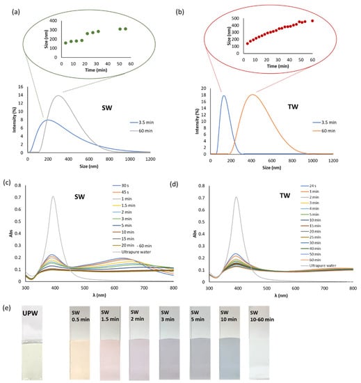Static DLS and UV-spectroscopy results for batch O2 diluted 1/4 with sea (SW) and tap (TW) waters measured at several times: (a) DLS registers for SW at different times including an insert, which shows the changes in size of AgNPs with time ; (b) DLS registers for TW at different times including an insert, which shows the changes in size of AgNPs with time; (c) Spectra of AgNPs with SW at several times, the SPR band for the dilution with ultrapure water was also included; (d) Spectra of AgNPs with TW at several times, the SPR band for the dilution with ultrapure water was also included; (e) Colour of the suspension in SW with time.