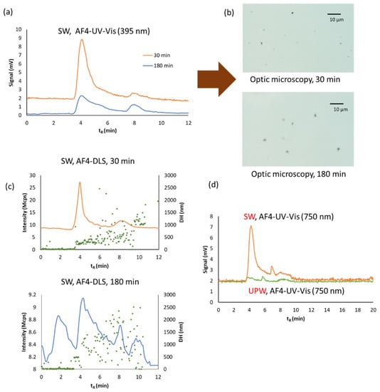 In order to study the polydispersity of the aggregated AgNPs, a slow crossflow was assayed (0.2 instead 1.0 mL·min−1 given in Table 1) for AF4. When lower crossflow was employed the retention times for bigger aggregates diminishes. Fractograms obtained for dispersions in SW and TW waters are given in Figure 9 and Figure 10, respectively. AF4 with UV-Vis and DLS in series showed two populations of NPs with different sizes for both dispersants. Dispersions in SW at 30 and 180 min measuring at 395 nm presented two peaks indicating two populations with different sizes (Figure 9a). Images obtained by optical microscopy showed the greater size of both aggregates at 180 min than those obtained at 30 min (Figure 9b). DLS detector permits the evaluation of the sizes as it can be seen in Figure 9c, fractograms indicate that the aggregates are bigger at 180 min than those obtained at 30 min. Figure 9d shows the fractograms at 750 nm giving the two populations too. A baseline signal was obtained for UPW dispersion at 750 nm, which is in accordance with its color (see Figure 8e) indicating no aggregation.