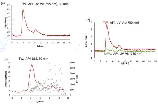 AF4 coupled in series with UV-Vis and DLS detectors for batch O2 diluted 1/4 with tap (TW) water measured at 30 min: (a) fractograms at 395 nm; (b) DLS fractograms; (c) Fractograms at 750 nm of TW and UPW. Crossflow was 0.2 mL·min−1.