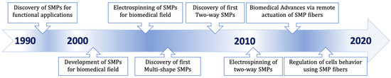 SMPs have been developed over the last three decades [26], as shown in Figure 1. The development of biodegradable SMPs [27], the multishape SMPs [28], two-way SMPs [29,30] and the electrospinning of SMPs for the biomedical applications [31] occurred in the 2000s. During the past decade, there has been a tremendous progress in biomedical advances using the remote actuation of SMP fibers [32] as well as the regulation of cells’ behavior through taking advantage of SMPs’ fibrous structures [33].